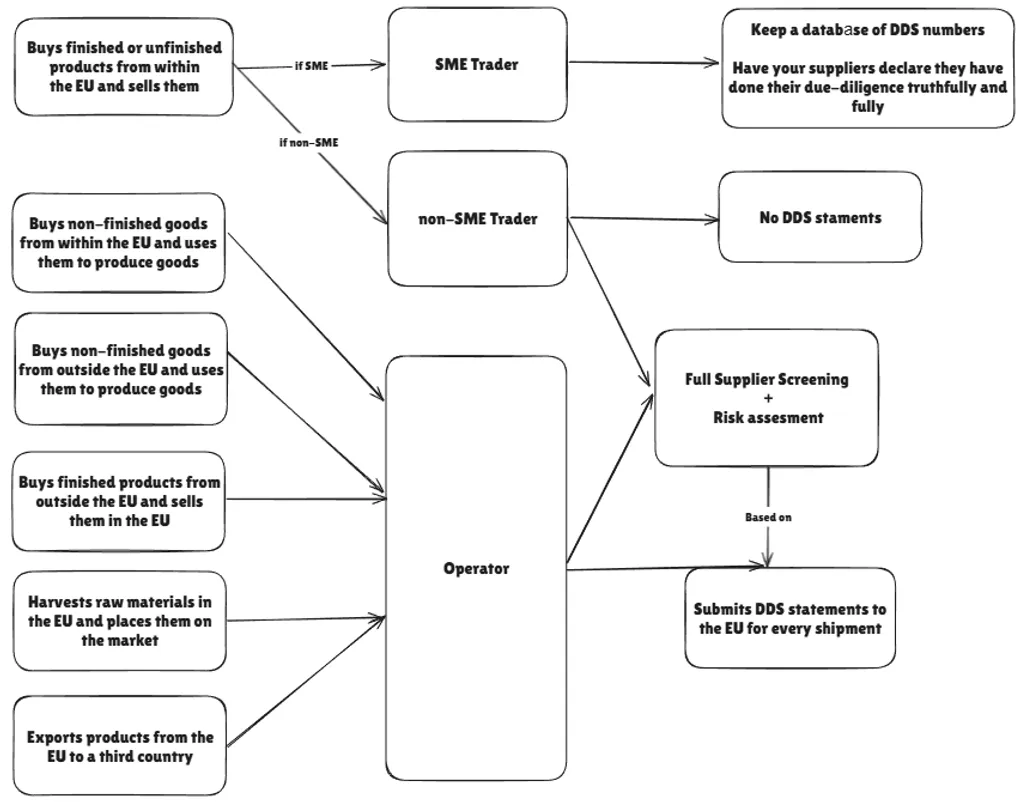 EUDR is the nickname of REGULATION (EU) 2023/1115 OF THE EUROPEAN PARLIAMENT AND OF THE COUNCIL of 31 May 2023 on the making available on the Union market and the export from the Union of certain commodities and products associated with deforestation and forest degradation and repealing Regulation (EU) No 995/2010. It sounds like nothing but trouble, we know, so here’s the TLDR: What it covers: The regulation applies to seven commodities and their derived products: cattle, cocoa, coffee, oil palm, rubber, soya, and wood. This includes items like beef, chocolate, furniture, and tires. The core requirements: Deforestation-free: The products must not have been produced on land that was deforested or subjected to forest degradation after December 31, 2020. This is a strict definition that includes both illegal and legal deforestation. Legally produced: The products must also comply with all relevant laws of the country of production, including those on land use, environmental protection, and human rights. Deforestation-free: The products must not have been produced on land that was deforested or subjected to forest degradation after December 31, 2020. This is a strict definition that includes both illegal and legal deforestation. Legally produced: The products must also comply with all relevant laws of the country of production, including those on land use, environmental protection, and human rights. Due diligence: Companies must perform rigorous due diligence to ensure compliance. This includes: Collecting information and data, such as the geographic coordinates of the land where the commodities were produced Conducting a risk assessment to determine if there is a risk of non-compliance. Implementing risk mitigation measures if a risk is identified. Enforcement: Non-compliance can lead to severe penalties, including fines of up to 4% of a company’s annual EU turnover, confiscation of goods, and a ban from the EU market for repeat offenders. Timeline: The new rules became applicable on December 30, 2025, for most companies, with a later date of June 30th 2026 for micro and small enterprises. If you don’t deal with any of the goods above in any way, shape or form, feel free to breathe a sigh of relief. If you are unsure whether or not you do, go to page 38 of the Regulation and take a look at the exhaustive list of commodities affected. If none of them are in your warehouse and never have been – relax, you are unaffected. If you are affected, though, strap in. Besides the actual requirements, the most difficult thing for companies to figure out is to what extent they apply to them. The Regulation makes a clear distinction between Operators and Traders and further between SMEs and non-SMEs. Traders are exactly what they sound like – resellers of EUDR-affected products that have already been placed on the EU market by a previous party. As long as traders are an SME, they are only required to keep a database of the due-diligence the previous parties have filed with the EU. If Traders are non-SMEs, then they are effectively Operators in terms of due-diligence requirements. Operators bear the majority of the bureaucratic load of the EUDR and almost all of the responsibility. An operator is the entity that first places a relevant product on the EU market or exports it from the EU. This includes: An importer bringing products from outside the EU into the EU. An EU-based company that transforms a relevant product (e.g., uses cocoa butter to make chocolate) and then places the new product on the market. An entity that harvests a relevant commodity within the EU and then makes it available on the EU market. An exporter shipping products from the EU to a non-EU country. Here is a chart to clear things up: